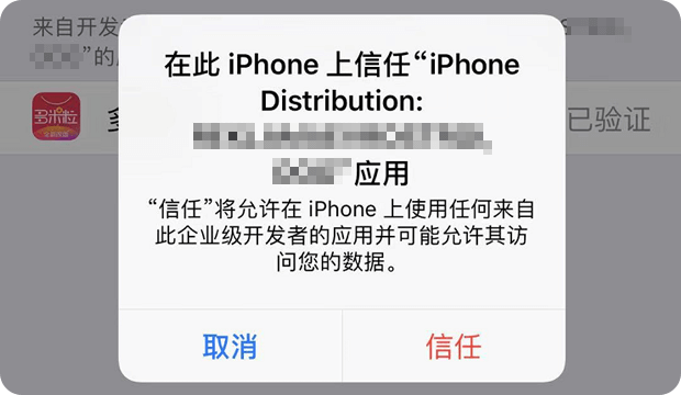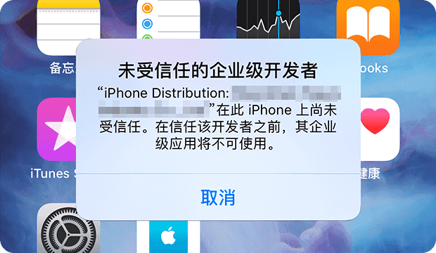 因苹果公司的政策调整,在iOS安装企业版应用时会出现以下提示。